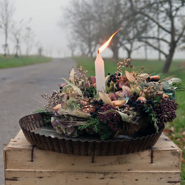 Je den mezi podzimem a zimou. Čas předadventní, kdy je každá chvilka slunečního svitu vzácná. Sluníčko se snaží prohřát zemi olemovanou krajkou ranní jinovatky, ale má už jen málo sil. Od úst ti stoupá pára dechu a těšíš se do tepla chaloupky. První Tvůj vjem je vůně jehličí mísící se s vůní perníčků. Ano, přesně ta vůně, která v tobě vykouzlí jedinečný hřejivý pocit svátků. Odneseš si jí domů ne jen v srdci, ale i s věncem, který si dnes vytvoříš. A protože se ti právě odmlžily brýle, konečně vidíš i tu krásu kolem. Dřevěná podlaha tisíci kroky ochozená, malá špaletová okénka, a koše plné různých větví a rostlin, které čekají, až z nich umotáš svůj adventní věnec. Taky uvidíš mně, jak tě vítám (no, pardon, něčím se ta idyla prostě musela trochu rozbít... ale zase jsem docela milá osoba...), a nabízím ti na zahřátí čaj nebo kávu. A pak už usedáš ke stolu, kde máš připravený jutový provázek a nůžky a začínáš tvořit svůj přírodní voňavý věneček. S každou další větvičkou z tebe padá shon všedních dnů a užíváš si svou květinovou meditaci. Do "zenu" se ladí i další dámy, které tu dnes s tebou tvoří. Je vás jen pár, klid, útulno. Někdy se rozvine příjemný rozhovor, protože když kmitají ruce, nejlépe se vypráví... Jako když se kdysi dralo peří... A někdy se jen tak mlčí a relaxuje, protože se nikam nespěchá. Jediné, co "musíš" je dotýkat se květinkových vzpomínek nasušených z léta i podzimních chvilek schovaných třeba v šípcích... A když si ruce potřebují odpočinout, zobneš si něco dobrého, dáš si čaj, a je ti prostě hezky... A až příště budeš tvořit další krásný věnec, protože už budeš vědět jak na to, zase se v tobě rozlije ten blahodárný klid. Proudy myšlenek utichnou a mysl se bude soustředit jen na pravidelný rytmus motání věnečku...